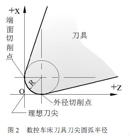 通過(guò)上面的刀具位置尺寸補(bǔ)償,我們已將數(shù)控編程的坐標(biāo)點(diǎn)設(shè)置在了刀具刀尖點(diǎn)上。但為了提高刀具的使用壽命和降低加工工件的表面粗糙度,通常將刀尖磨成半徑不大的圓弧,一般圓弧半徑尺寸在0 . 4 ~ 1. 6 mm 之間,如圖 2 所示。很顯然,假想刀尖點(diǎn)與實(shí)際切削點(diǎn)是不同點(diǎn),當(dāng)加工與坐標(biāo)軸平行的圓柱面和端面輪廓時(shí),刀尖圓弧并不影響其尺寸和形狀。但當(dāng)加工錐面、圓弧等非坐標(biāo)方向輪廓時(shí),刀尖圓弧將引起其尺寸和形狀誤差,而且刀尖圓弧半徑越大,誤差越大。這種誤差的大小不僅與輪廓形狀、走勢(shì)有關(guān)。而且與刀尖圓弧半徑有關(guān),當(dāng)零件加工精度要求較高時(shí),就可能出現(xiàn)超差,所以如果在數(shù)控加工或數(shù)控編程時(shí)不對(duì)刀尖圓角半徑進(jìn)行補(bǔ)償,僅按照工件輪廓編制的程序來(lái)加工,勢(shì)必會(huì)產(chǎn)生加工誤差[ 1]。