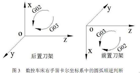 實(shí)踐證明,在實(shí)際生產(chǎn)過(guò)程中,可以不考慮右手笛卡爾坐標(biāo)系,直接看零件圖就判斷出圓弧加工的左右補(bǔ)償,即在圓弧編程時(shí),始終只分析零件圖軸線上半部分圓弧形狀,當(dāng)沿該段圓弧形狀從起點(diǎn)畫(huà)向終點(diǎn)為順時(shí)針?lè)较驎r(shí)就用GO2 ,反之就用 GO3。原因很簡(jiǎn)單,車(chē)床指向刀架的為X 軸的正方向,指向尾座為Z 的正方向,那么前后刀架的X 軸的方向是相反的,就導(dǎo)致參與判斷的第三軸 Y 軸的正方向是相反的,一個(gè)指向紙外,一個(gè)指向紙內(nèi),如圖3 所示。在后置刀架的數(shù)控車(chē)床加工中,由于 Y 軸指向紙外,在 XOZ 坐標(biāo)系中我們直接選擇工件的零件圖軸線上半部分圓弧形狀判斷圓弧順逆,而前置刀架的數(shù)控車(chē)床Y 軸指向紙內(nèi),我們選擇工件的零件圖軸線下半部分圓弧形狀判斷圓弧順逆時(shí)應(yīng)該從紙內(nèi)向紙外觀察,其結(jié)果正好與