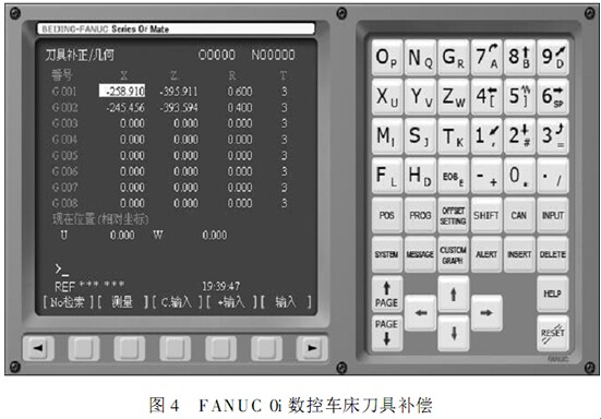 在FAN UC 的數(shù)控編程中,用 T 功能選擇刀具并調(diào)用刀具補(bǔ)償,其格式為 T xx x x ,其中前兩個(gè) xx為刀具號(hào),后兩個(gè) x x 為刀具補(bǔ)償號(hào),如 T0202。如果刀具補(bǔ)償號(hào)為00 , 則 表 示 取 消 刀 補(bǔ)。 按 下OFFSE T SE TTING 后在 CRT 上顯示刀具補(bǔ)正界面,按下補(bǔ)正對(duì)應(yīng)的功能軟件后在CRT 上將顯示磨耗和形狀兩個(gè)選項(xiàng),如圖4 所示,其中一般將對(duì)刀結(jié)果存儲(chǔ)在形狀存儲(chǔ)器中,而磨耗存儲(chǔ)器中一般用于輸入切削余量和修正對(duì)刀結(jié)果以及由于刀具磨損形成的零件加工誤差。磨耗和形狀均對(duì)應(yīng)刀具位置補(bǔ)償( X 和 Z 值) 和刀具圓弧半徑補(bǔ)償( R 和 T 值) 共 4 個(gè)參數(shù)。在加工之前,將對(duì)刀結(jié)果和相應(yīng)的磨耗補(bǔ)償輸人到對(duì)應(yīng)的存儲(chǔ)器CRT 上顯示。在自動(dòng)執(zhí)行過(guò)程中,數(shù)控系統(tǒng)按該存儲(chǔ)器中的 X 、 Z 、R 、T 的數(shù)值,自動(dòng)修正刀具的位置誤差和自動(dòng)進(jìn)行刀尖圓弧半徑補(bǔ)償[ 2]。