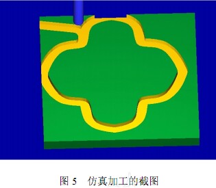 MasterCAM 軟件可以通過仿真加工驗證程序是否正確 ,如圖 5 是仿真加工的截圖. 一切準備就緒后就可以把程序輸入到數控銑床上加工 ,一般采用在線加工的方法: 通過數據傳輸軟件一邊傳輸程序一邊完成非圓弧復雜平面曲線的加工;如果還需要修改程序 ,可以打開保存的 MCX文件重新設置相應的參數 ,重新生成加工軌跡和NC代碼.