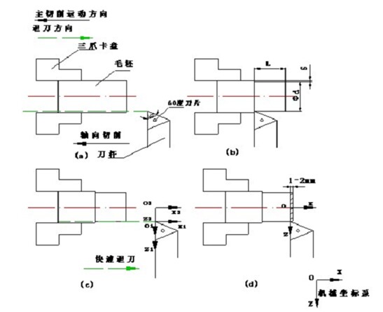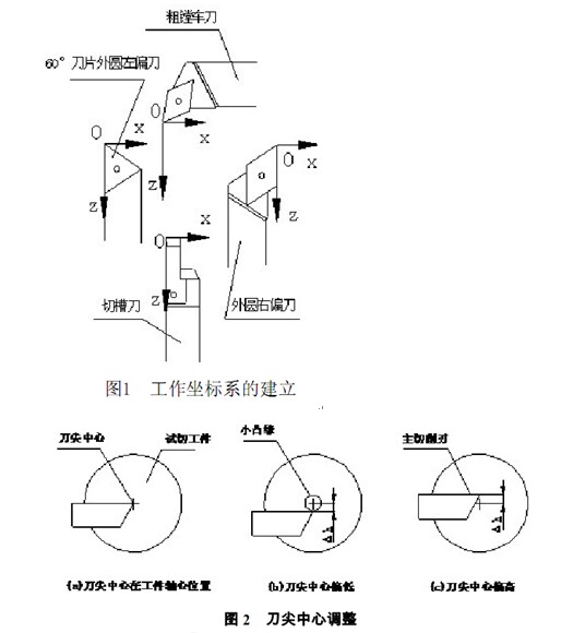 在工件坐標(biāo)系建立之前, 還要考慮到車刀安裝后刀尖中心是否處于軸心位置的, 因此, 單把車刀的對(duì)刀包括:刀尖中心的高度調(diào)整和工件坐標(biāo)系的建立兩個(gè)過程.