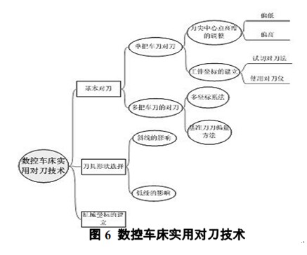綜上, 本文論述的實(shí)用數(shù)控車床實(shí)用對(duì)刀技術(shù)能有效地提高零件的加工精度, 方便操作人員合理地選擇刀具, 對(duì)實(shí)際生產(chǎn)具有重義. 全文的知識(shí)框架如圖6所示: