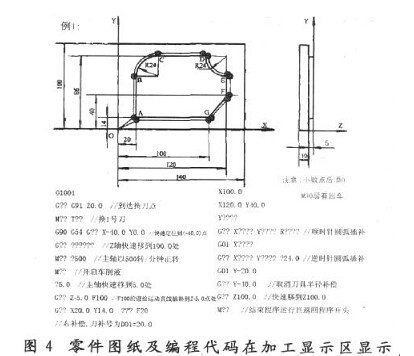 單擊圖形顯示按鈕“后退”,在顯示區顯示要加工的零件圖紙,然后根據圖紙和加工路線,結合現有編程代碼,完成數控編程。單擊“后退”按鈕,零件圖紙及編程代碼在加工顯示區顯示出來,如圖4所示。