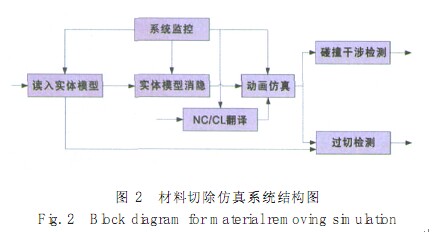 對于材料切除過程仿真, 國內外也有一些研究成果, 主要集中在相應的算法方面。 如基于 Z- map 結構的算法[11]、 基于 Dexel 模型的快速成型算法[12], 等等??偟膩碚f, 材料切除過程的仿真主要有兩個功能: 一是檢測是否過切、 干涉、 碰撞, 以檢測 NC代碼和刀位文件的正確性; 二是通過逼真的三維動畫來實現可視化仿真, 為虛擬制造提供支撐環境。圖 2 為一個典型的材料切除仿真子系統的功能結構圖。