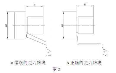 切槽刀常見撞刀現(xiàn)象如圖2 主要有兩種情況: 1 在是進刀過程中刀具與工件 48 外圓發(fā)生干涉,導致零件報廢和刀具碎裂等 2 是退刀過程中刀具退刀路線與工件發(fā)生不應有的撞擊 在編寫程序時針對切槽刀應注意以下三點就可避免切槽刀撞刀現(xiàn)象發(fā)生: