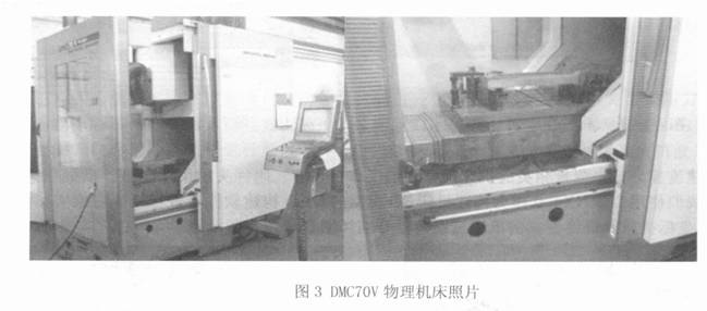 DMC70V 德瑪吉物理機(jī)床屬于三軸立式高速加工中心, 其主軸為X / Y/ Z, 機(jī)床的行程為 700 mm @500 mm @ 650 mm, 控制系統(tǒng)為Heidehan iTNC530, 配備的刀柄主要為H SK 高速銑刀柄. 物理機(jī)床的影像資料如圖3所示[ 2]