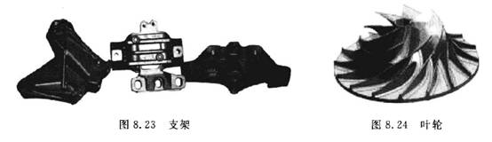 (1)葉輪類零件。葉輪多是航空發(fā)動機的壓氣機、空氣壓縮機、船舶水下推進(jìn)器等的重要組成部分,該類零件除具有一般曲面加工的特點外,還存在通道狹窄,刀具很容易與加工表面和鄰近曲面產(chǎn)生干涉等眾多加工難點。圖8. 24所示是葉輪,它的葉面是一個典型的三維空間曲面,加工這樣的型面,可采用四軸以上聯(lián)動的加工中心。從加工的可能性來講,對于復(fù)雜曲面類零件,在不出現(xiàn)加工盲區(qū)或加一工過切時,復(fù)雜曲面可采用球頭銑刀進(jìn)行三坐標(biāo)聯(lián)動加工,加工精度較高,但效率較低。若工件(如整體葉輪)等存在加工盲區(qū)或加工過切,就必須考慮采用四坐標(biāo)或五坐標(biāo)聯(lián)動的機床。