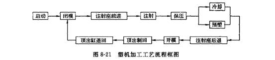 根據上述原理,塑機在一個加工周期中的工藝流程框圖如圖8-21所示。