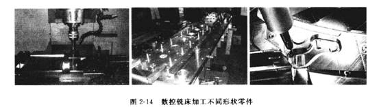 數(shù)控銑床的加工具有適應(yīng)性強(qiáng)、范圍廣的特點(diǎn)。其靈活性強(qiáng)的特點(diǎn)主要表現(xiàn)在利用一臺(tái)機(jī)床可以加工不同形狀的零件,如圖2-14所示。在數(shù)控銑床上加工的絕大多數(shù)零件屬于平面類(lèi)零件,一般只需用數(shù)控銑床的兩坐標(biāo)聯(lián)動(dòng)就可以完成加工。