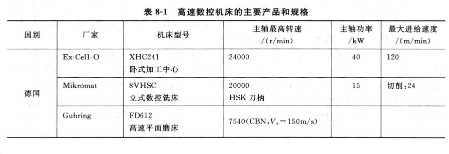 滾珠絲杠的疾速進(jìn)結(jié)速度可達(dá)40一60m/mtH,直線電機(jī)的疾速進(jìn)給速度高達(dá)90一120m/min。此外,高速機(jī)床的主抽和作業(yè)臺(tái)還要具有杰出的加速度功能,主軸從啟動(dòng)到最高轉(zhuǎn)速的時(shí)刻只用1—2s,作業(yè)臺(tái)的加速度到達(dá)lf一105。表8—1列出了這些年國(guó)際上幾種高速機(jī)床的首要產(chǎn)品和標(biāo)準(zhǔn)。