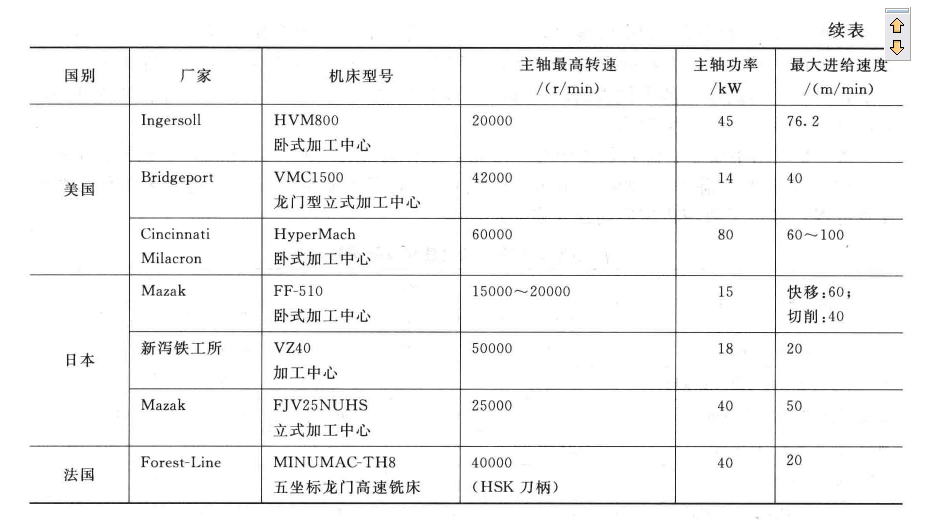 日本日立精機(jī)的HG400皿型加工中心主軸最高轉(zhuǎn)速達(dá)36000一40000r/min,作業(yè)臺(tái)疾速移動(dòng)速度為%一40m/min。選用直線電機(jī)的美國(guó)Ingersoll公司的HVM800型高速加工中心進(jìn)給移動(dòng)速度為60m/min。美國(guó)洛克希德飛機(jī)公司在高速銑削鋁合金時(shí),當(dāng)主軸轉(zhuǎn)速?gòu)?/span>4000r/min進(jìn)步到20000r/min,資料切除率添加3倍。單位功率的資料切除率可到達(dá)130一160cm’/(min.kW),是一般銑削的4—5倍。