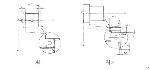 中的一把常用的刀稱為基準(zhǔn)刀,把其它的刀稱為非基準(zhǔn)刀。如果刀位偏差為零,如圖1所示,則每一把刀轉(zhuǎn)到加工位置時(shí),其刀位點(diǎn)都應(yīng)在圖1A所示的位置。但由于每一把刀的幾何形狀及其安裝位置的不同,不同刀位上的刀具轉(zhuǎn)到工作位置時(shí),它們的刀位點(diǎn)的位置并不重合,如圖2所示,而在X、Z向存在一定的偏差。我們將非基準(zhǔn)刀的刀位點(diǎn)相對于基準(zhǔn)刀的刀位點(diǎn)(或基準(zhǔn)點(diǎn))在X、Z向的偏差ΔΧ、ΔΖ稱為刀位偏差(簡稱刀偏)。