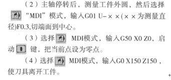 (1)用外圓車刀先試切一段外圓,按功能鍵POS,按軟鍵[(OPRT)],當(dāng)未顯示[WRK-CD]時(shí),按菜單繼續(xù)鍵>,按軟鍵[WRK-CD],輸入X0,按軟鍵[AXS-CD]。