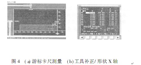 ( 4)用手輪方式將 01 號外圓車刀試車工件外圓一段(這一段不必太長也不必太深, 長度只要能放上游標卡尺或千分尺就可以,深度要保證不影響整個零件前段尺寸的加工) , 將刀具沿+ Z 軸移出, 此時 X 軸不能移動,停主軸用游標卡尺或千分尺測量剛被車過的地方,圖 4( a)游標卡尺測量,如圖 2已車表面, 點擊 MDI鍵盤上的 offset setti ng 鍵, 進入刀具補償界面,按 CRT 顯示器軟鍵所對應的形狀, 在 01 號刀 X 軸中輸入測量得來的數值,如圖 4( b) 所示,點擊控制面板上的/ 刀具測量0 ,再點擊軟鍵對應的/ 測量0 , 01 號刀具 X 軸對刀完成, 即1 號刀具 X 軸工件坐標系建立, 此時 X 軸可隨意移動。