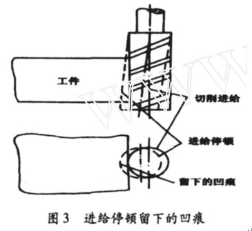 廓 ,以保證工件質(zhì)量。退刀時刀具也必須沿曲線切向退刀 ,然后再返回起點 ,見圖 2。如果沿法向切入 ,會留下明顯的刀痕。應盡量避免在進給中途停頓 ,引起接刀痕 ,見圖 3。如果加工時必須進行垂直切入 /切出引導 ,這時必須使刀具遠離工件進行切入 ,同時 ,建立刀補 ,然后沿要求的軌跡進行切削加工 ,當切削完成時 ,沿切出引導線遠離已加工工件 ,同時撤離刀補。應特別注意在工件被加工曲面處垂直工件表面的方向下刀或抬刀。