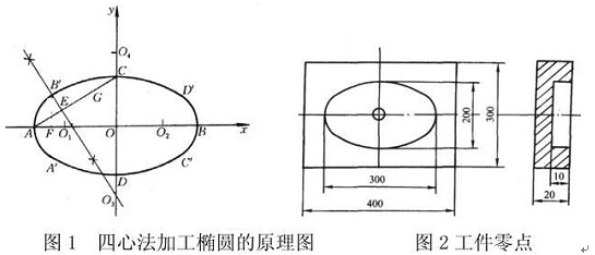 現(xiàn)在大部分?jǐn)?shù)控系統(tǒng)都不具備橢圓插補(bǔ)功能, 在加工中心上加工橢圓的方法也成了數(shù)控機(jī)床使用者長期探討的問題。我們這里采用伯特利V系列加工中心為實(shí)際操作平臺來取得數(shù)據(jù),現(xiàn)在在加工中心上加工橢圓的方法主要有兩類, 一類是原理逼近法, 一類是圖樣逼近法。在原理逼近法中又有四心法和比例法兩種。對圖樣逼近法來說, 數(shù)控系統(tǒng)的不同, 所用的方法也是有差別的, 比如 FANUC系統(tǒng)用的是宏程序, S I NUMER-I K所用的是 R參數(shù)法, FAGOR所用的是高級語言法。現(xiàn)在主要對原理逼近法進(jìn)行介紹。