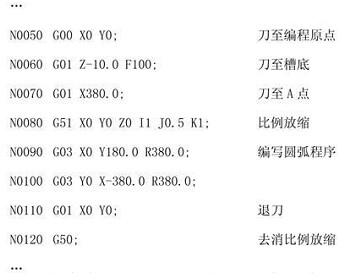 由于在應(yīng)用比例放縮編程時, 刀具半徑是不會改變的, 所以不能應(yīng)用刀具半徑補(bǔ)償功能編程, 只能應(yīng)用刀具中心編程。