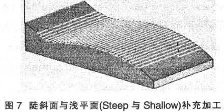 ( 7) 陡斜面與淺平面(Steep 與 Shallow)補充加工( 圖 7) 。加工之前首先分析計算曲面斜度, 將曲面斜度大于某一設定值的曲面定為陡斜面, 反之為淺平面。該方法可以測定并補充加工由平行加工及 Z向等距加工后的殘留高度過大的曲面區域。在圖 7中, 曲面斜度設為 30°, 所以曲面角度小于 30°的才進行補充加工。