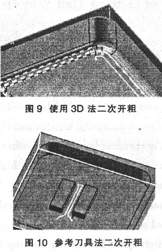 第二種, 參考刀具法。在圖 10 中, 由于兩凸臺間距為 8mm, 而在粗加工中選用了直徑 20mm的刀具, 所以刀具無法進入兩凸臺間進行切削, 此時就可以采用二次開粗中的“參考刀具”法, 選用直徑小于 8mm的刀具就可以得到圖中的刀具軌跡。